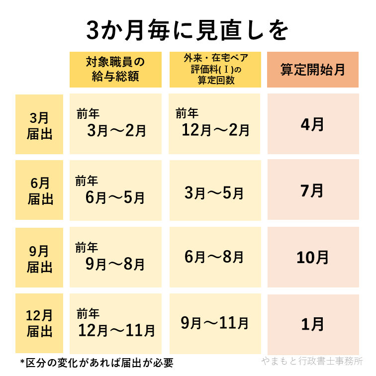 届出時期、届出に必要なデータの実績期間、新たな評価料の算定開始月は以下のとおりです。